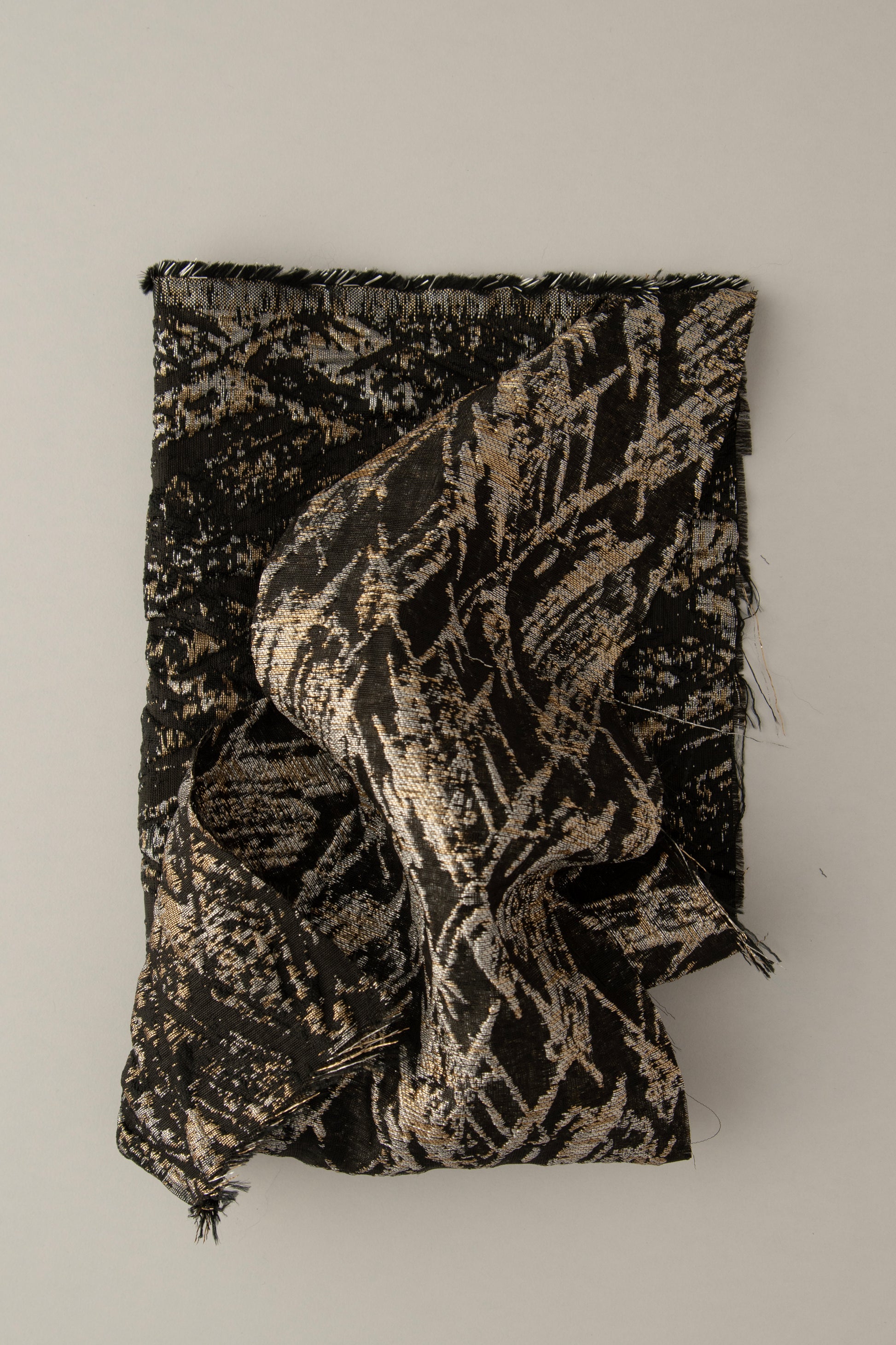 Chaqueta en jacquard en fondo negro, con detalles metalizados en dorado y plateado con una textura luminosa que aporta brillo sin rigidez. Su estructura ligera acompaña el movimiento y eleva cualquier look con un destello sutil y moderno.
